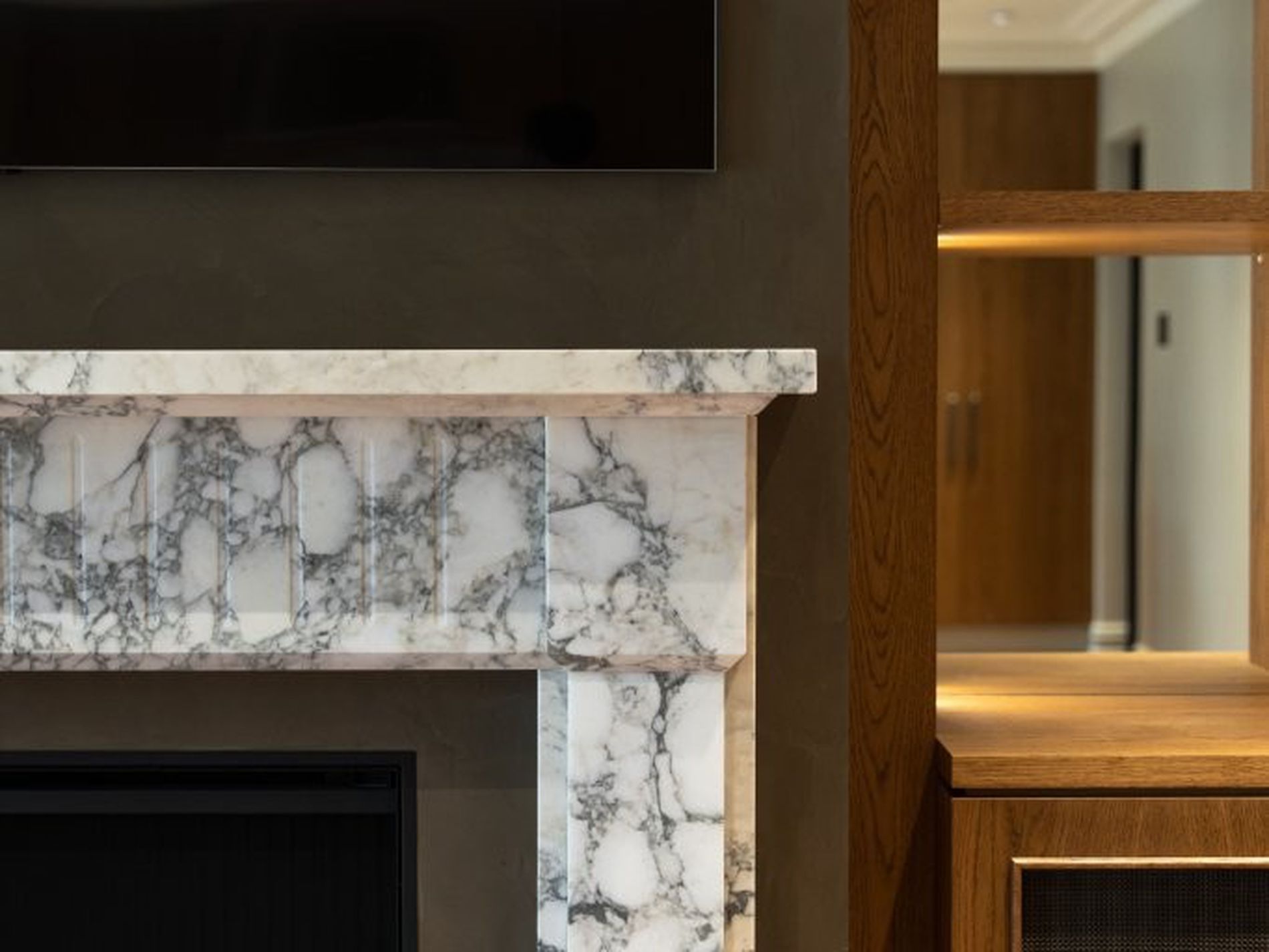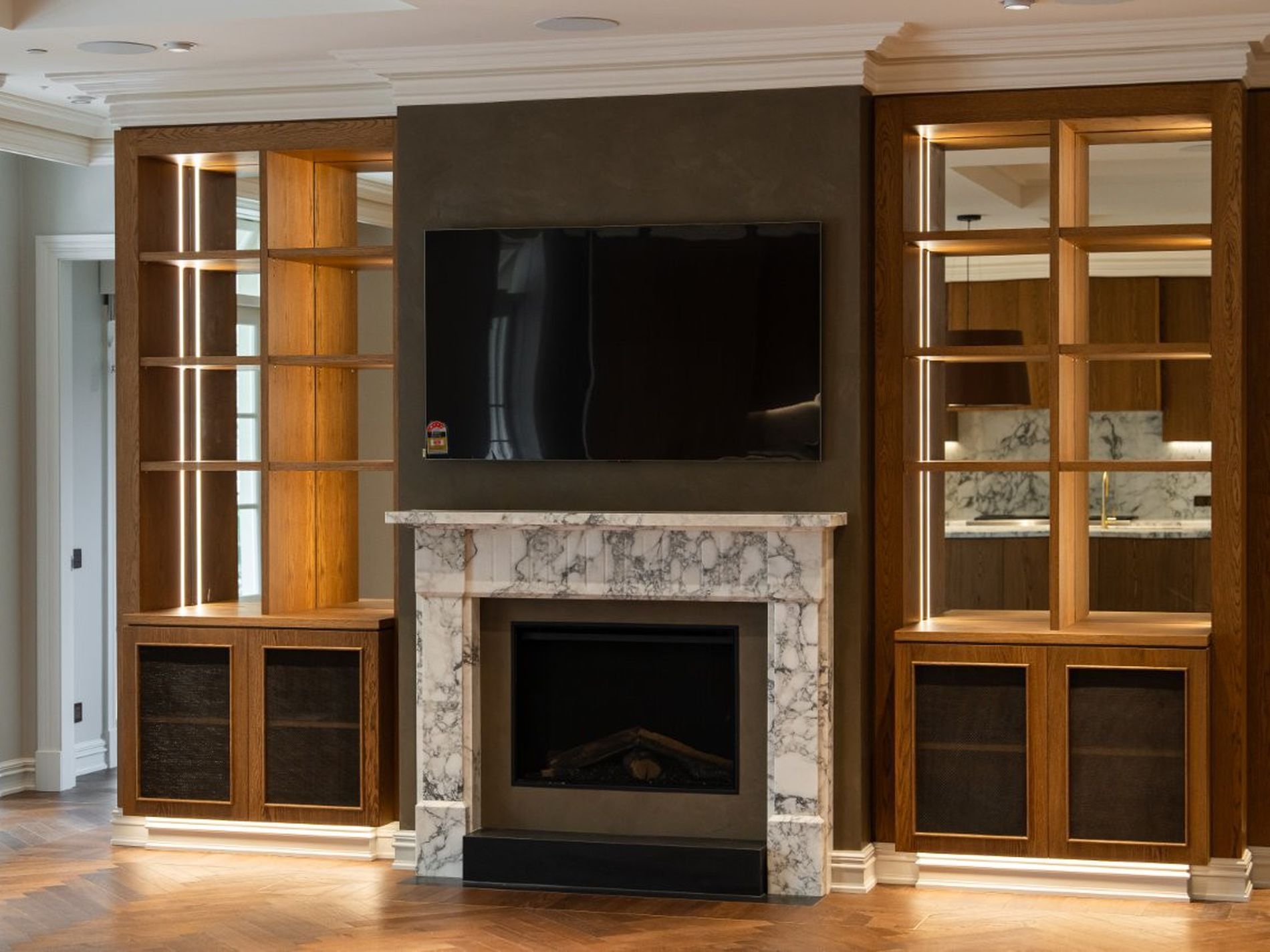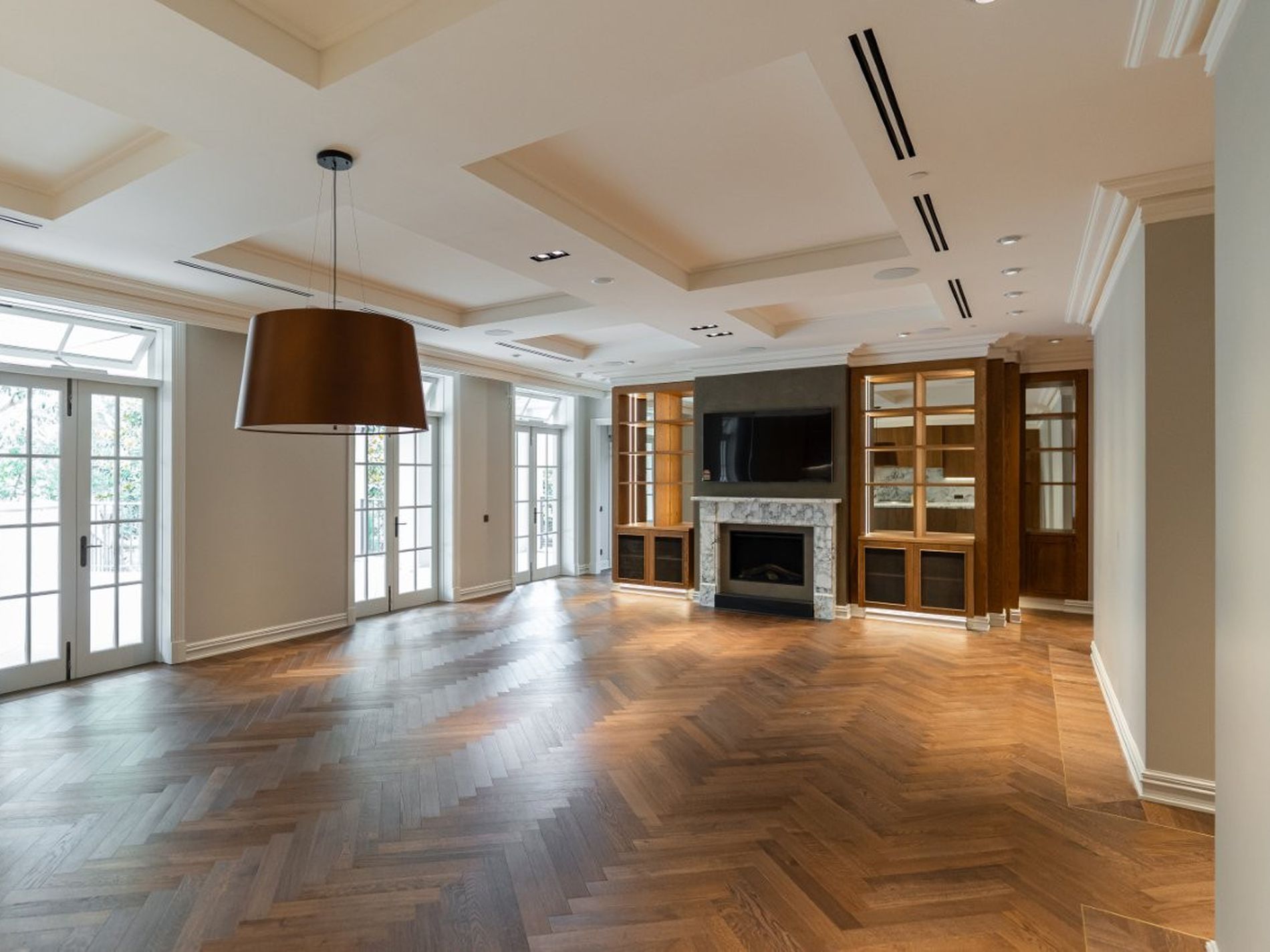 - Huge open living/dining room with library shelves, marble fireplace